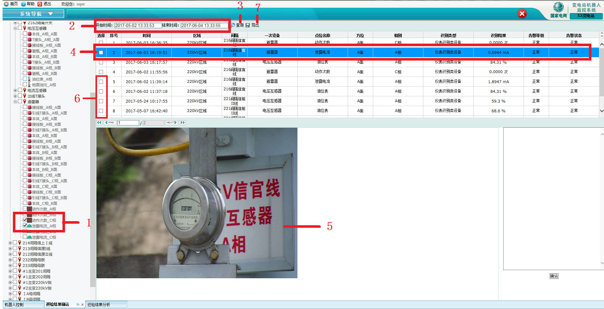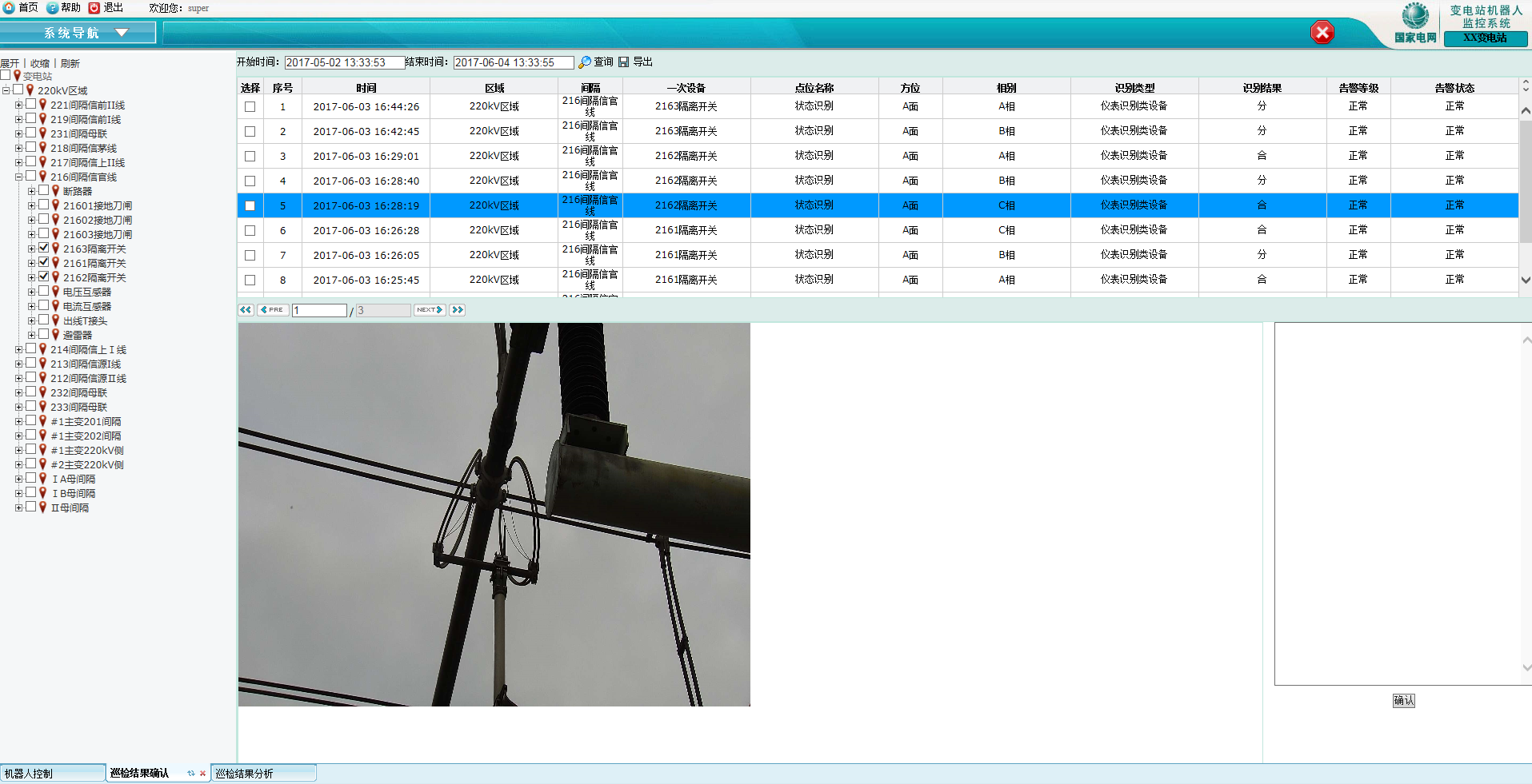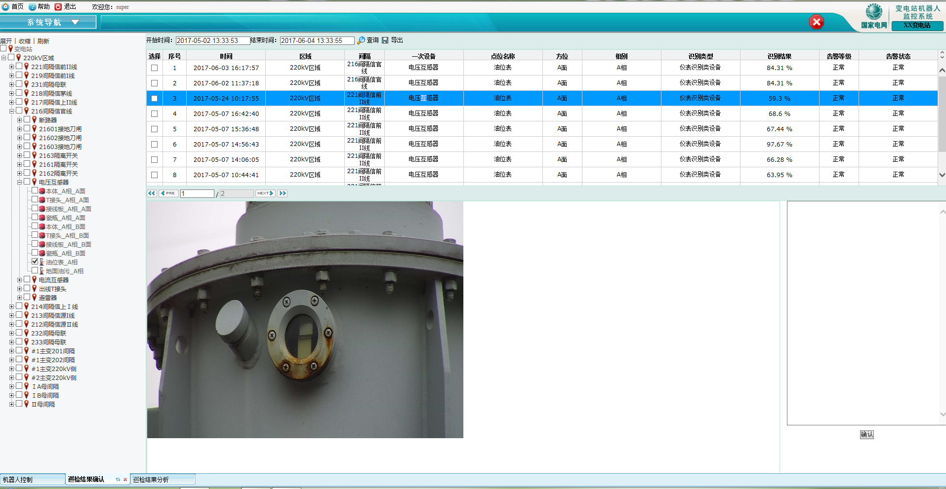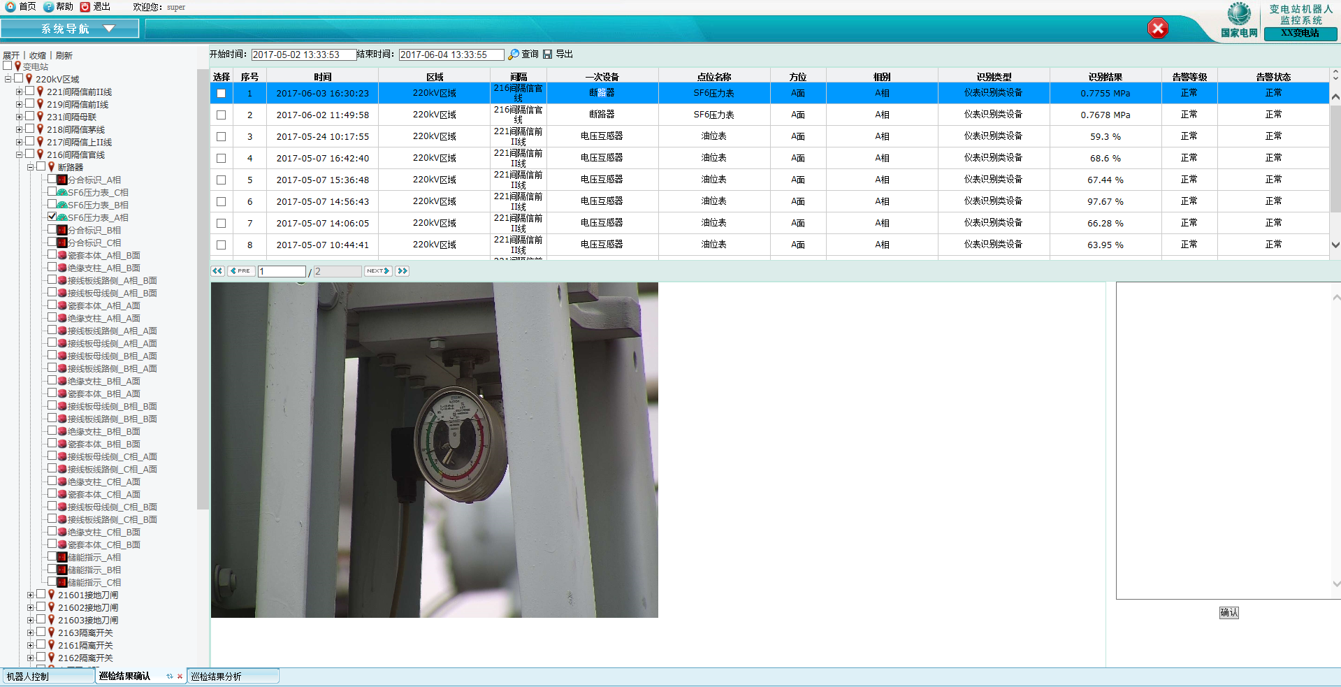 3)點(diǎn)擊『查詢』按鈕實(shí)現(xiàn)查詢將顯示所有的巡檢結(jié)果記錄,在下方頁面將顯示所有要搜索的巡檢信息(如巡檢時(shí)間、所在區(qū)域、間隔、一次設(shè)備、點(diǎn)位名稱、方位、相別、識(shí)別結(jié)果、告警等級、告警狀態(tài));