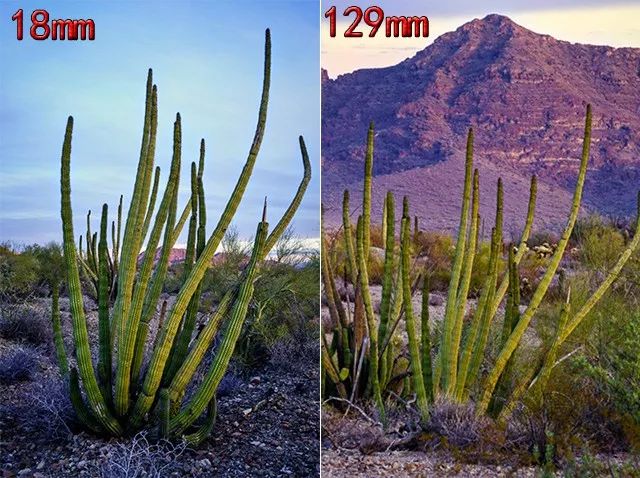可以看到,在廣角鏡頭拍出的照片里,背景元素(山)顯得非常小;而在長焦鏡頭拍出的照片里,背景元素十分有存在感。