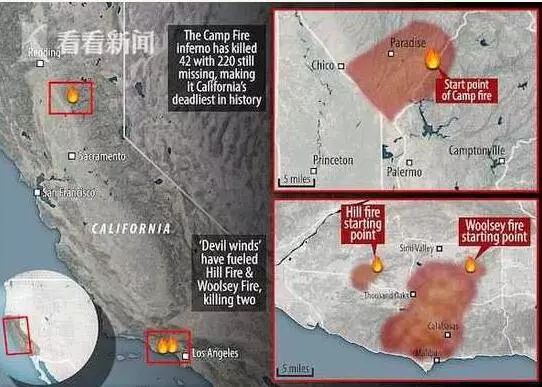 美國(guó)加州北部野火死亡人數(shù)上升至48人、200多人失蹤,此前,加州南部也發(fā)現(xiàn)了2具遺體,此次大火導(dǎo)致總死亡人數(shù)上升至50人。