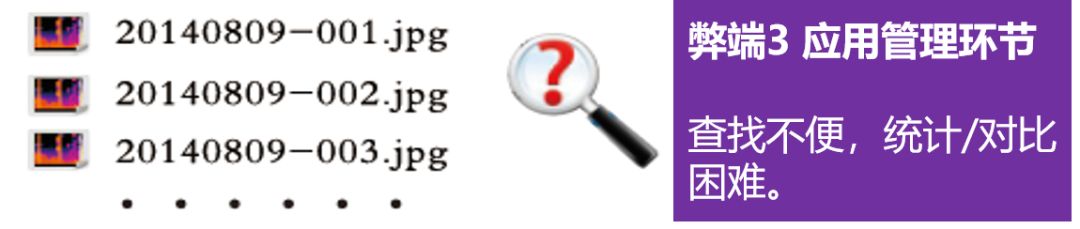 領(lǐng)導(dǎo),您看這個缺陷,當時拍回來之后,班組長告訴我說,這個接頭是老缺陷,總是發(fā)熱,維修了好幾次,但還是熱,所以我決定去查一下過往的拍攝記錄,才發(fā)現(xiàn),壓根沒法查。因為之前的熱像圖,沒怎么整理,就是直接打包一存,壓根不知道哪個圖片對應(yīng)的是哪臺設(shè)備。其次,部分數(shù)據(jù)雖然有命名,但是查找起來也很麻煩,因為只能通過windows自帶的文件名搜索工具逐級查找,每個人的命名習慣不一樣,導(dǎo)致搜索起來也很麻煩,不能一次搞定。