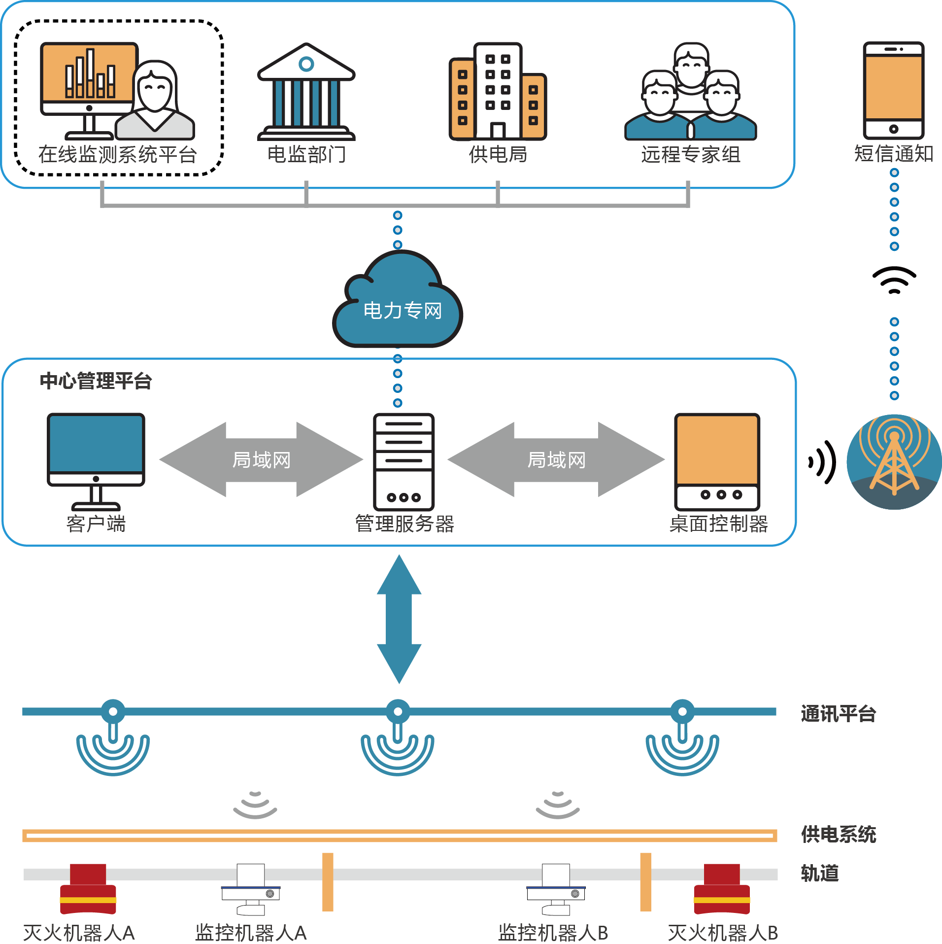 系統(tǒng)包括遠程管理平臺、本地中心管理平臺、通信平臺、供電系統(tǒng)、智能機器人五大部分