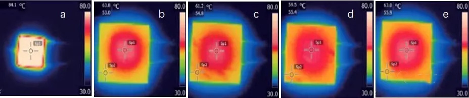 下圖為不同規(guī)格的散熱薄膜材料的篩選對(duì)比,其中a為對(duì)照組,熱源不做任何散熱措施,b~d熱像圖所用散熱材料從上到下的微觀分層為:
