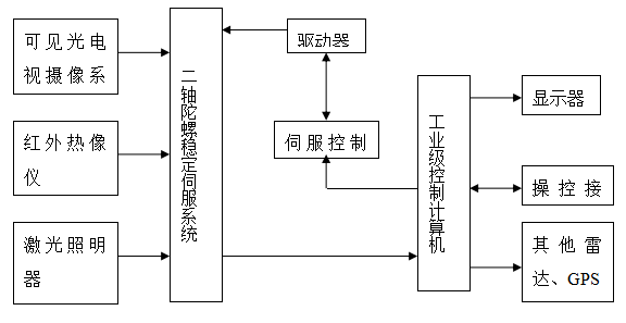 光電指向器采用球形結構,具有風阻小,抗風能力強的優(yōu)點;采用陀螺穩(wěn)定系統(tǒng)能夠有效地隔離因強風造成的安裝平臺搖擺,從而保持光電攝像系統(tǒng)的穩(wěn)定,得到清晰、穩(wěn)定的圖像,而且保證目標圖像始終在電視屏幕上而不丟失。