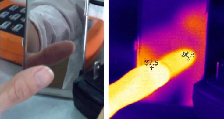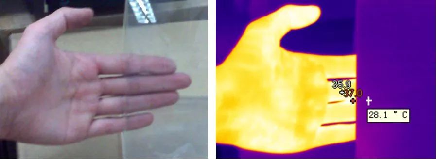 下圖中當手和紅外測試儀之間被亞克力隔離后,會發(fā)現(xiàn)手指的熱成像也被阻斷了,所以圖中28.1℃只是亞克力表面的溫度。實際上只有少數(shù)材料可以透過紅外線,如:鍺、硅、塑料薄膜等,而且當在測量路徑上有這些材料的時候,也必須將材料的透射率參數(shù)輸入熱像儀中,否則測量結(jié)果并不可靠。