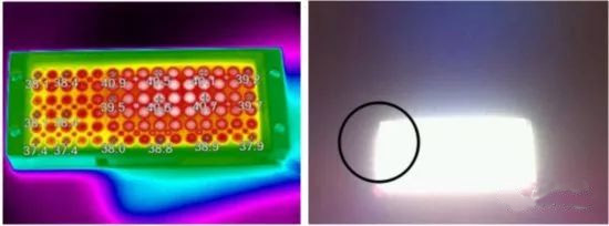 熱像儀通過紅外輻射檢測燈具中溫度分布的不同來確認(rèn)問題燈珠的位置,或修正設(shè)計中的散熱問題。