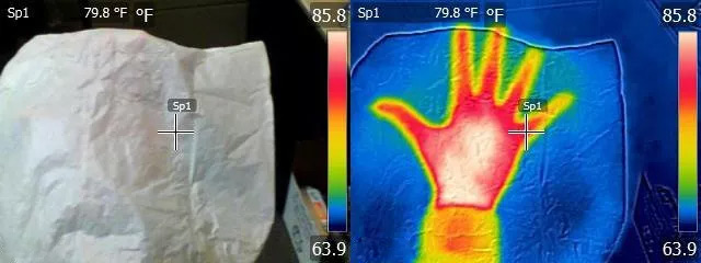 我們可以紅外熱像儀做一個有趣的小實驗:在一個溫暖的物體或人面前舉起一張薄薄的不透明的塑料片(如垃圾袋)。紅外輻射將穿透塑料,使熱相機能夠探測到塑料背后的帶有溫度的東西,而可見光卻被阻擋。但是要說明一下,這個技巧只適用于非常薄的塑料,厚塑料就會阻擋住紅外輻射。