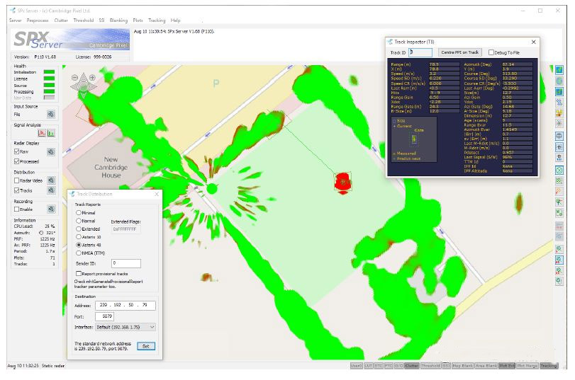 雷達(dá)目標(biāo)追蹤模塊可以是獨(dú)立的SPx Server完成,也可以集成到定制開發(fā)或框架開發(fā)服務(wù)中。在雷達(dá)覆蓋范圍內(nèi),可以完成自動(dòng)目標(biāo)追蹤。目標(biāo)錄取器是高度可配置的軟件模塊,它可以根據(jù)雷達(dá)類型、追蹤目標(biāo)大小、應(yīng)用場景不同而配置,追蹤報(bào)告可以發(fā)送到網(wǎng)絡(luò)中,用以控制攝像頭跟隨追蹤拍攝目標(biāo)。