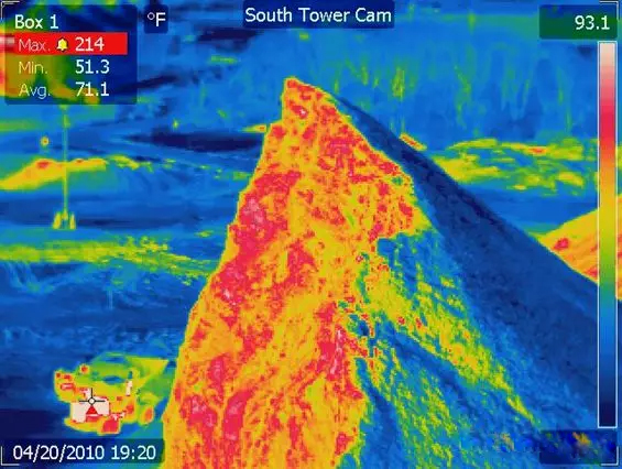 當(dāng)煤發(fā)生自燃時,煤層表面的溫度升高,但肉眼并不能觀察到。紅外熱像儀采用640*480探測器,其像素是常規(guī)320*240熱像儀的4倍,距離是其2倍。所以,在探測煤層溫度時,可以在很遠(yuǎn)的距離就可檢測到煤層表面的溫度,以圖像的形式呈現(xiàn)出來,在熱像儀顯示屏上可以清晰的看到高溫和低溫用不同的顏色標(biāo)示,顯示的高溫區(qū)就是隱性火區(qū),在發(fā)現(xiàn)后即可采取相應(yīng)措施以防治煤層自燃。