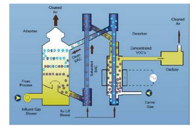 利用吸附劑(粒狀活性炭和活性炭纖維)的多孔結(jié)構(gòu),將廢氣中的VOC捕獲。將含VOC的有機(jī)廢氣通過活性炭床,其中的VOC被吸附劑吸附,廢氣得到凈化,而排入大氣。