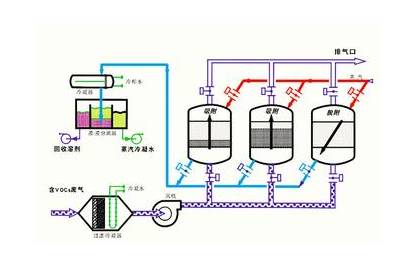 當(dāng)炭吸附達(dá)到飽和后,對(duì)飽和的炭床進(jìn)行脫附再生;通入水蒸汽加熱炭層,VOC被吹脫放出,并與水蒸汽形成蒸汽混合物,一起離開炭吸附床,用冷凝器冷卻蒸汽混合物,使蒸汽冷凝為液體。