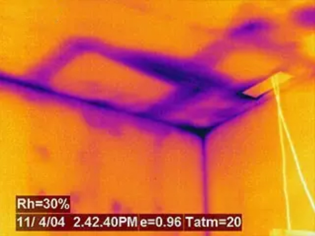 為了加快樓宇的干燥過(guò)程,通常需要使用干燥設(shè)備。干燥設(shè)備生成的熱量能夠蒸發(fā)墻壁和其他區(qū)域的水份。仍然潮濕的區(qū)域可以被紅外熱像儀方便地加以檢測(cè),并在紅外圖像中以“冷點(diǎn)”形式出現(xiàn)。