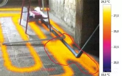 用紅外熱像儀快速掃描地板,能夠準確查找和定位水暖管的滲漏點,有的放矢的開展維修工作。省時又省力。將用戶的損失風(fēng)險控制在最低。(以下為示意圖)