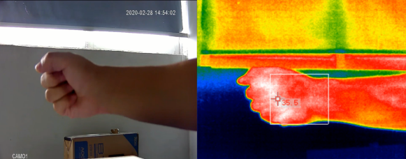 1) 可見光、紅外雙同步進(jìn)行人體檢測,可見光識別人臉人體,紅外進(jìn)行精準(zhǔn)額頭定位測溫