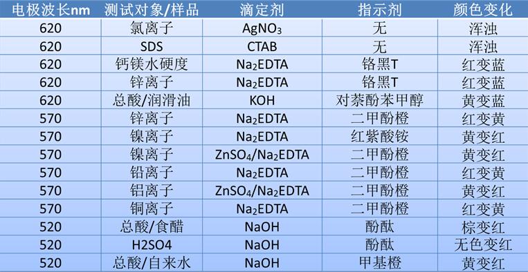 除水硬度外,光度滴定儀還可應(yīng)用于大量其他的滴定應(yīng)用,比如Ni離子、Zn離子的分析等,由于沒有合適的指示電極,這些離子往往無法使用電位滴定儀進(jìn)行測試,而光度滴定可以很好地實現(xiàn)類似離子的分析。