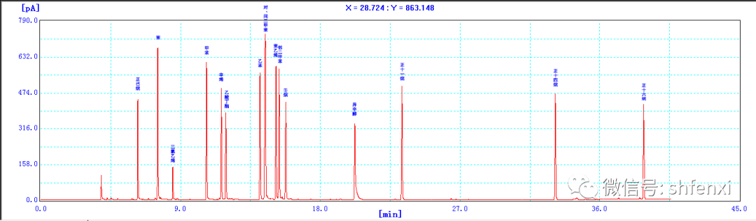 從左至右依次為: (1)正己烷 (2)苯 (3)三氯乙烯 (4)甲苯 (5)辛烯 (6)乙酸丁酯 (7)乙苯 (8)對、間二甲苯合峰 (9)苯乙烯 (10)鄰二甲苯 (11)壬烷 (12)異辛醇 (13)正十一烷 (14)正十四烷 (15)正十六烷