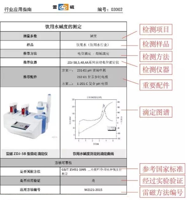 《行業(yè)應(yīng)用指南》針對(duì)不同行業(yè)的分析測(cè)試需求,以簡(jiǎn)易的表格形式列出完成該檢測(cè)項(xiàng)目所需的關(guān)鍵信息。包括:行業(yè)信息、測(cè)試項(xiàng)目、樣品名稱、測(cè)試方法、主要儀器設(shè)備、關(guān)鍵配件、測(cè)試圖譜(如有)、測(cè)試方法依據(jù)、以及雷磁《應(yīng)用方法》文件信息。