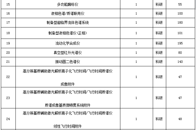 此次采購(gòu)項(xiàng)目包含24臺(tái)/套儀器設(shè)備,其中質(zhì)譜相關(guān)儀器6臺(tái)/套,液相色譜?相關(guān)儀器3臺(tái)/套,顯微鏡相關(guān)儀器2臺(tái)/套,此次招標(biāo)可謂是近期儀器采購(gòu)項(xiàng)目中的又一大單。
