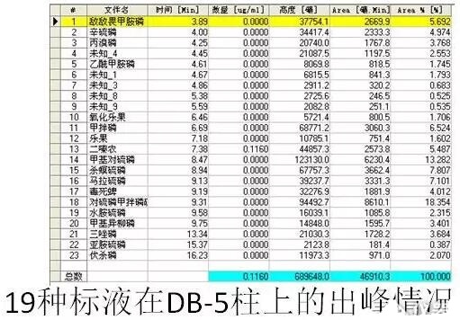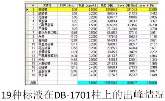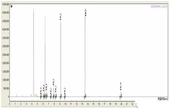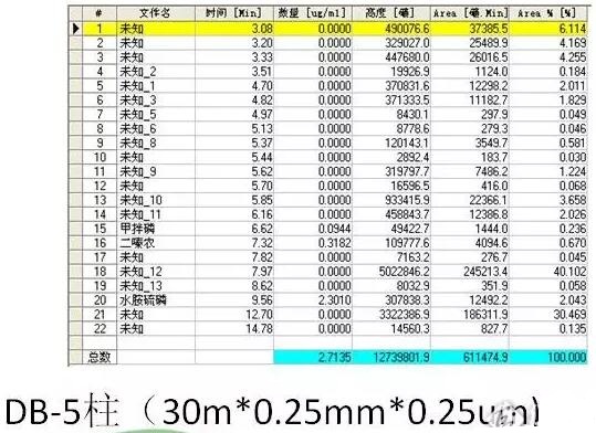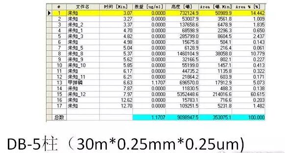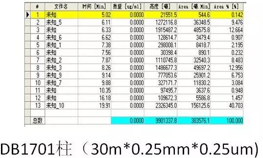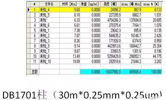 例三:在更換不同極性色譜柱進(jìn)行定性時(shí),一定要進(jìn)標(biāo)液,在不同柱子上確定峰面積與保留時(shí)間。