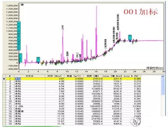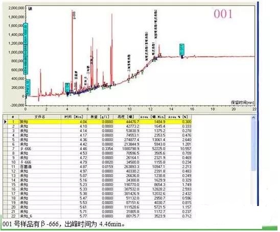 用改變程序升溫的方法判斷,001號(hào)樣品有β-666,還要用第二種方法再確認(rèn),在001號(hào)加入β-666,可以看到β-666的峰面積與含量均增加不少,說(shuō)明是β-666檢出并超過(guò)限量值。