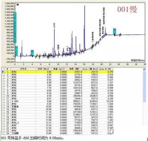 ①樣品001號(hào)β-666有檢出,我們用兩個(gè)程序升溫來(lái)判斷,將程序升溫變慢后,仍有β-666檢出。