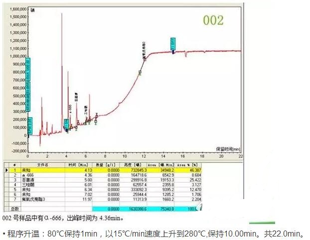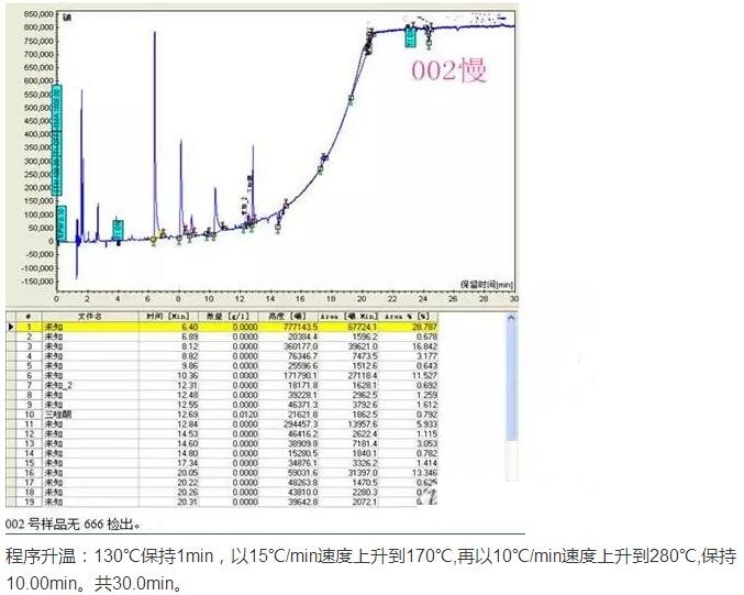 ②樣品002號(hào)有α-666檢出,用兩個(gè)程序升溫來(lái)判斷,將程序升溫變慢后,α-666未檢出。