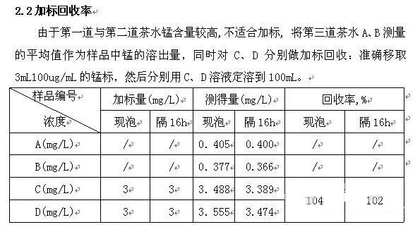 本實驗著重對茶葉中錳的自然溶出量進行測試,并對現(xiàn)泡茶與隔夜茶進行比較,給廣大飲茶愛好者一個參考依據(jù)。