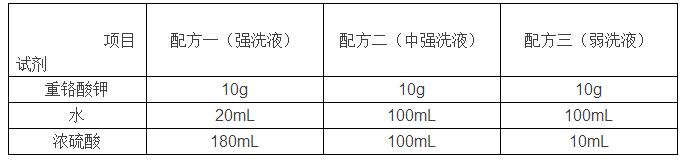 重鉻酸鉀(K2Cr2O7)在酸性溶液中,有很強(qiáng)的氧化能力,對玻璃儀器又極少有侵蝕作用。所以這種洗液在實(shí)驗(yàn)室內(nèi)使用最廣泛。配制濃度各有不同,從5~12%的各種濃度都有。配方見下表,本實(shí)驗(yàn)室采用配方一(強(qiáng)洗液)。
